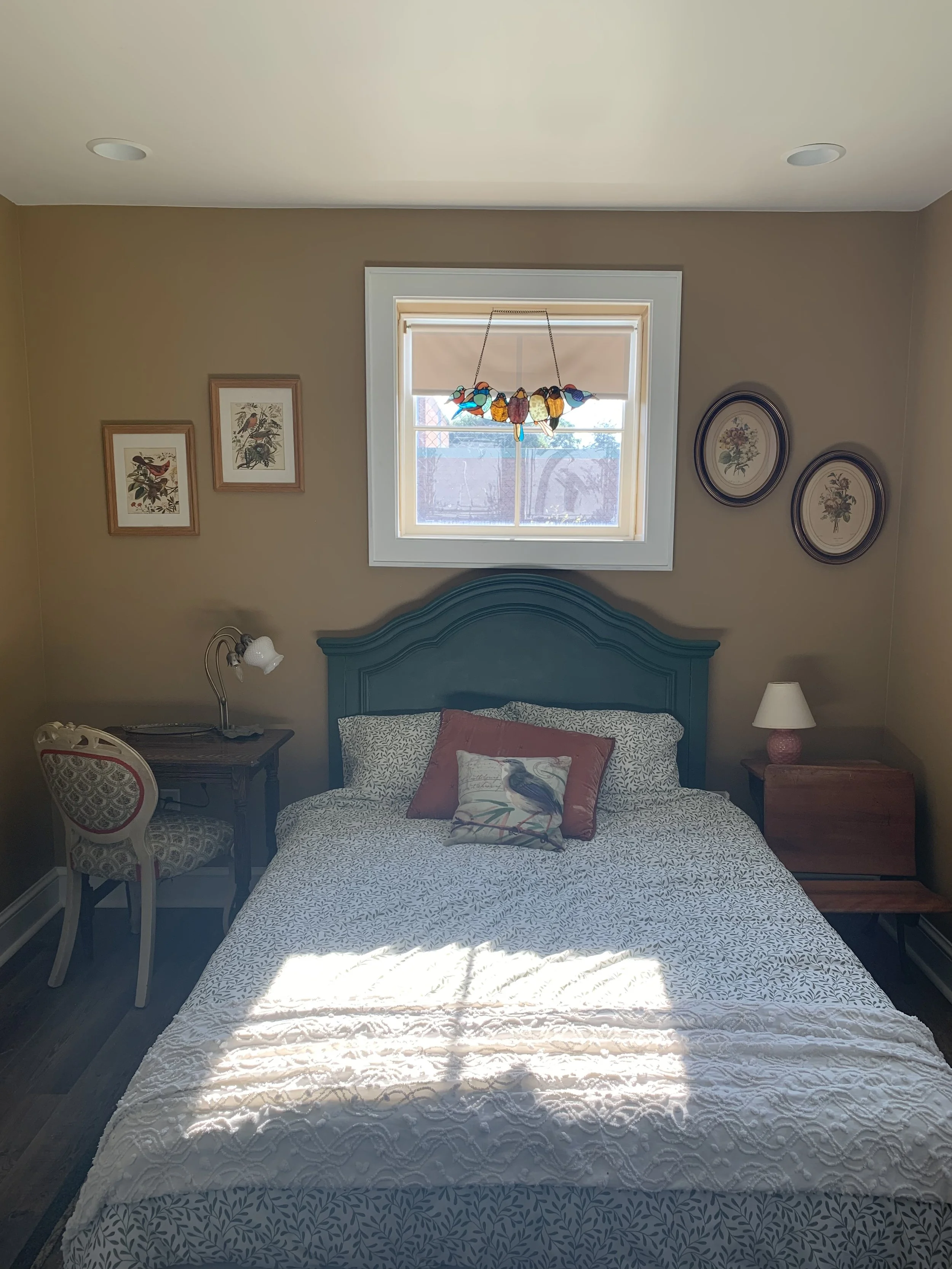 The squirrel room is a bit smaller, so I found a small dresser from the Restore. I might paint it, but I don’t mind the dings, it gives it personality. Most of the art we had collected through the years. My friend Elysia made the wall hanging for us years ago. It has been up in many spaces, the colors are great. One of my big conundrums with this room is the window placement. Since it was not centered over the bed, I decided to put up the wall shelf, to add balance.